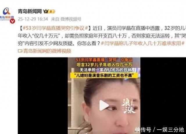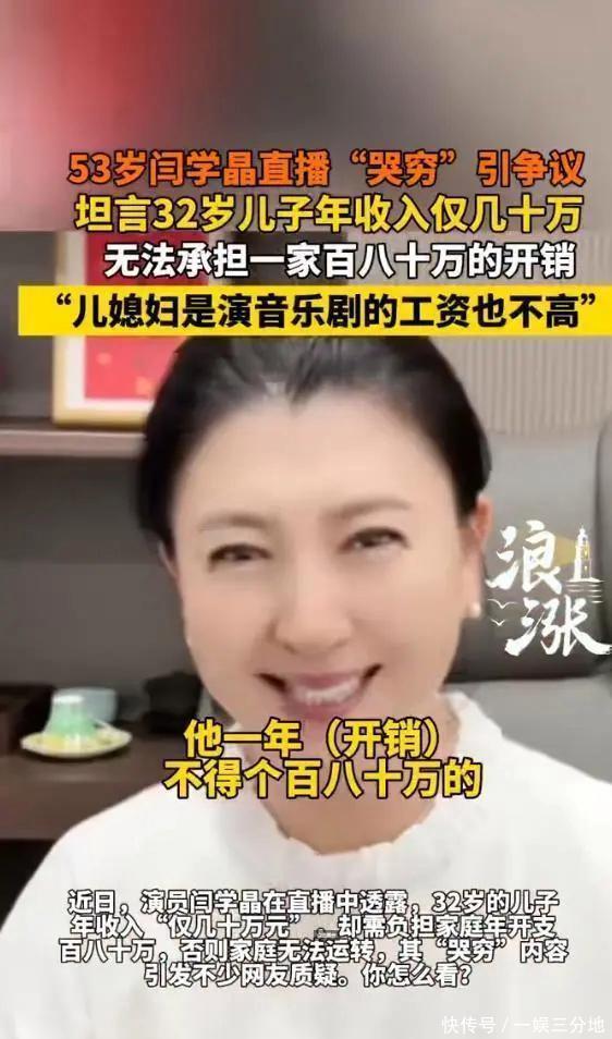 2025年12月的娱乐圈热搜,被闫学晶的一场“哭穷直播”搅得鸡飞狗跳。本该是带货冲业绩的直播间,这位老戏骨却对着镜头红了眼眶,一把鼻涕一把泪地吐槽:“我32岁的儿子年入才20-30万,在北京根本撑不起家!”这番凡尔赛式诉苦刚出口,全网网友的吐槽弹幕就像潮水般涌来,直接把“闫学晶何不食肉糜”送上了热搜第一。合着在明星眼里,年入几十万已经沦落到“活不下去”的地步了?这波操作,比她演的苦情戏还让人出戏。