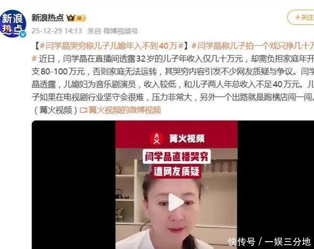 先给没吃着瓜的朋友补个课:12月29日,闫学晶准时开启直播,镜头里的她全程眉头紧锁,语气焦虑得像是天要塌了。她对着观众细细拆解儿子林傲霏的“生存困境”,那架势比会计对账还认真。“我儿子是中戏科班出身,现在也是个演员,可行情不好啊,一年到头就接一部戏,挣个20-30万。”她顿了顿,又补充道,儿媳徐梦迪是搞音乐剧的,受众窄收入薄,小两口全年加起来收入都凑不够40万。说这话时,她还频频叹气,眼神里满是“恨铁不成钢又心疼”的复杂情绪,不知道的还以为她家快揭不开锅了。